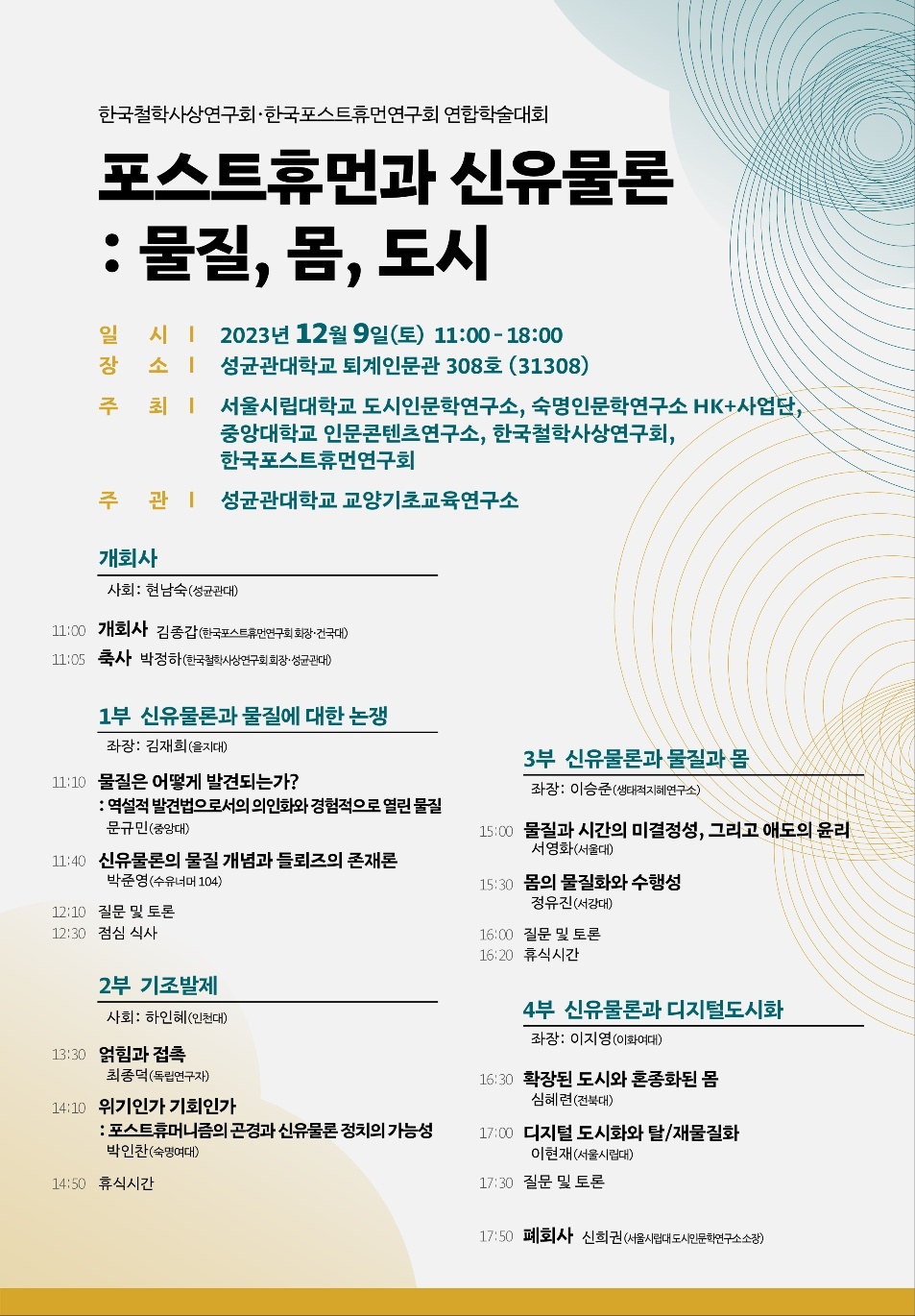 2023년 가을 제65회 정기 학술대회 포스터(연합학술대회-한국포스트휴먼연구회) 〈포스트휴먼과 신유물론: 물질, 몸, 도시〉